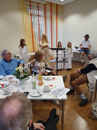Der 2. Vorstand Roland Dressel hatte für die Anwesenden noch eine Überraschung parat, er wollte nämlich endgültig die Frage (auch aus seiner eigenen Kindheit) klären: gibt es nun ein Christkind ja oder nein. Da wurden wir alle angenehm überrascht - plötzlich inmitten der Feier stand nämlich wahrhaftig das Christkind mit ihren drei wirklich süßen Engelein vor der Türe und präsentierte Ihre großartige himmlische Weihnachtsansprache - anschließend verteilten diese Himmelsboten noch für jeden Gast ein Geschenk. Es war einfach wunderbar und wir wurden alle in unsere Kindheit regelrecht zurückversetzt.